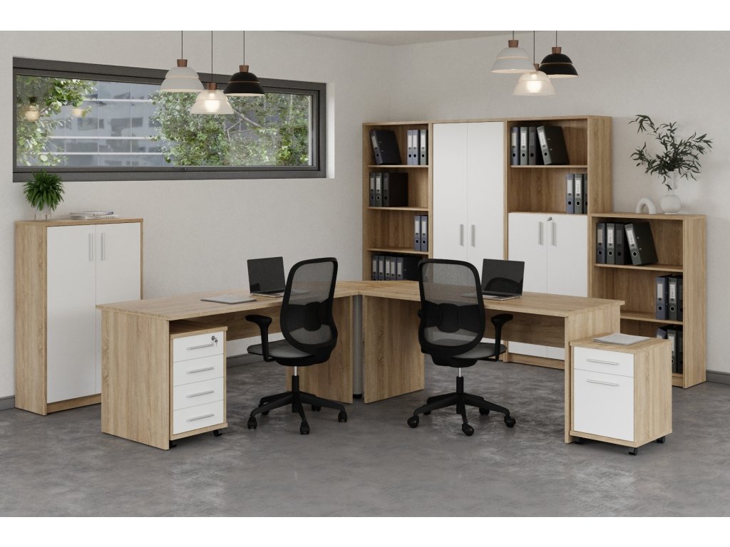 Vzorová kancelárska zostava je dokonale funkčným a prakticky zorganizovaným priestorom, nepostrádajúcim ani dostatočne reprezentatívny vzhľad. Tento systém sa skladá z viacerých prvkov, z ktorých je možné zostaviť kanceláriu podľa vašich predstáv. Farebné prevedenie: dub sonoma/biela Zostava sa skladá: - kontajner (šxvxh): 38,2 x 55,9 x 41,4 cm - regál nízky (šxvxh): 72,5 x 115,8 x 33,8 cm - 2 ks kancelársky písací stôl (š 67,5 cm - skrinka (šxvxh): 72,5 x 115,8 x 33,8 cm - regál vysoký (šxvxh): 72,5 x 186,2 x 33,8 cm - uzamykateľný kontajner (šxvxh): 38,2 x 6 skriňa (šxvxh): 72,5 x 186,2 x 33,8 cm - skriňa (šxvxh): 72,5 x 186,2 x 33,8 - rohový prvok (šxvxh): 67,5 x 74 x 67,5 cm Materiál: lamino Dodáva.Dodatočné parametre