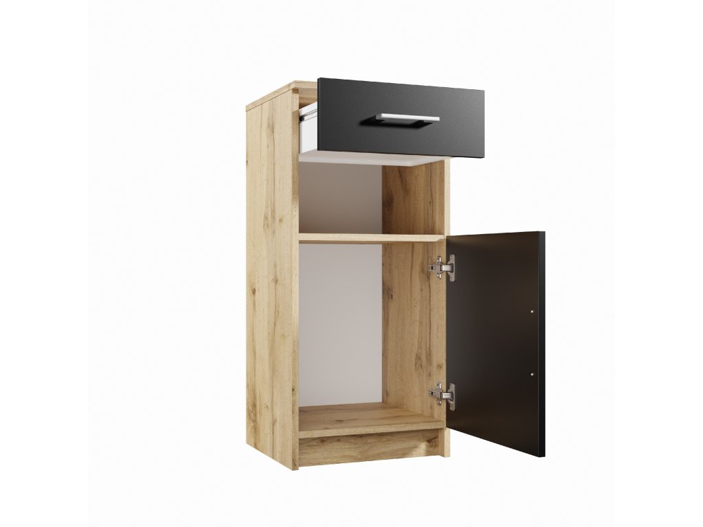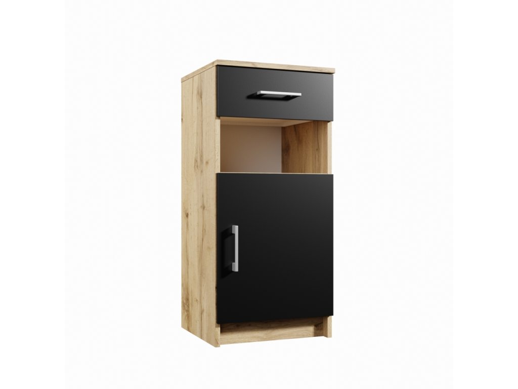 Komoda s dvierkami a zásuvkou Rozmery (šírka x výška x hĺbka): 40 x 87 x 38 cm Materiál: LTD lamino, úchytky plast Farba: korpus - dub wotan, dvierka - čierna Dodanie v demonte.Dodatočné parametre