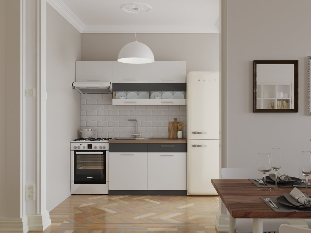 Kuchynská zostava 120/180 cm Kuchyňa o rozmere 120 cm (dolný rad) / 180 cm (horný rad) - jedná sa len o jednu z možných zostáv, možno dokúpiť ďalšie skrinky alebo celú kuchyňu zostaviť podľa svojich predstáv - viď zaradenie produktu. Farba: korpus - rijeka svetlá, dvierka - biely lesk / grafit mat Rozmery: - dolné skrinky: výška 82 cm, hĺbka 50 cm, šírky: 60 cm - dolná drezová skrinka D60Z 60 cm - dolná skrinka D60S1 - horná sk šírky: 60 cm - horná skrinka nad digestor G60o 60 cm - horná vitrína G60W - 2 kusy Materiál: korpus LTD, dvierka MDF, ABS hrana 1 mm. Kovové pojazdy METALBOX v zásuvkách Drez, spotrebiče a pracovná doska nie sú v cene. Dodáva sa v demonte. Záruka 24 mesiacov.Dodatočné parametre