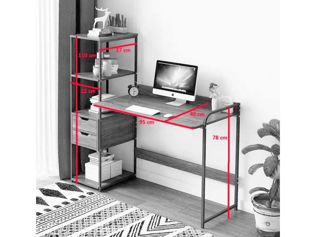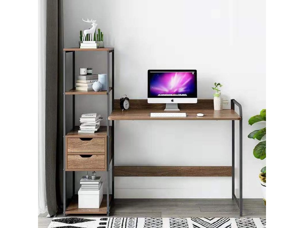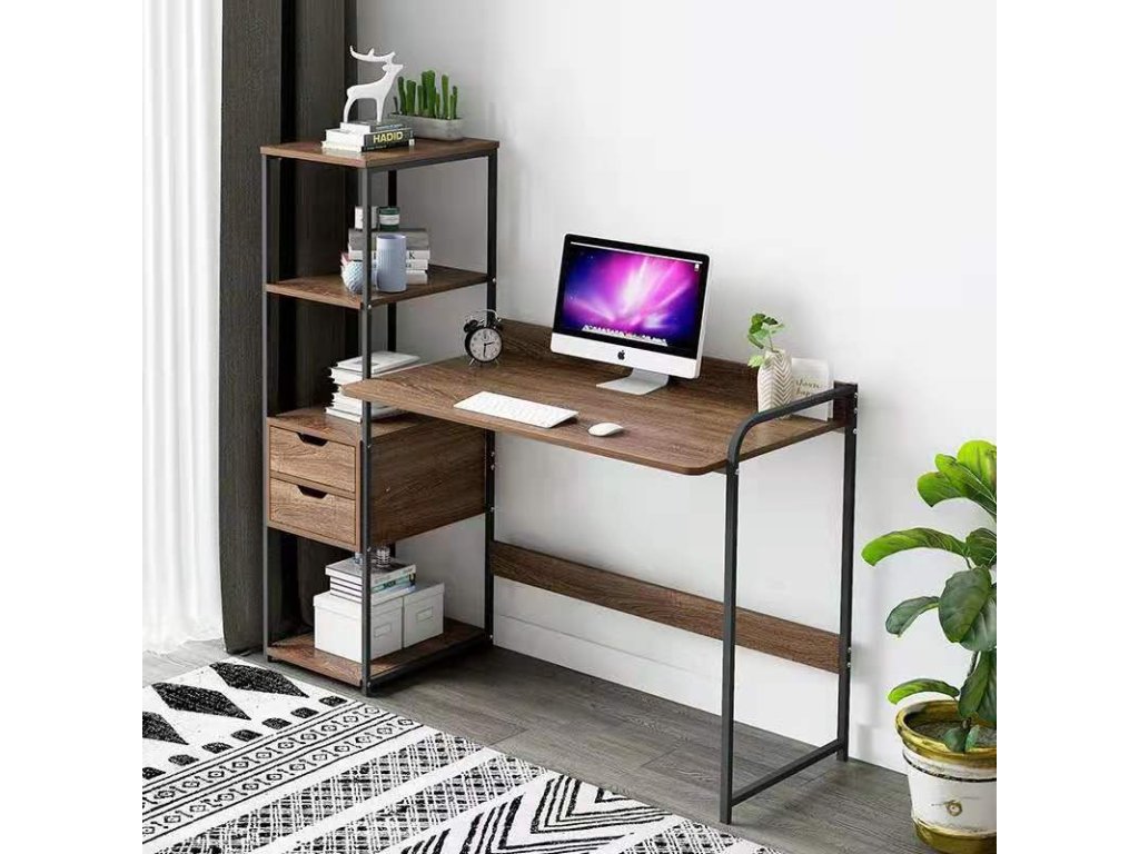 Elegantný písací stôl do pracovne, kancelárie aj študentskej izby s praktickým regálom a dvoma šuplíkmi. Stôl ponúka kvalitné spracovanie v podobe pevnej oceľovej konštrukcie čiernej farby. Doska stola a police sú vyrobené z MDF dosky vo farbe orech. Rozmery (šírka x výška x hĺbka): 122 x 110 x 40 cm Dodávané v demonte.Dodatočné parametre
