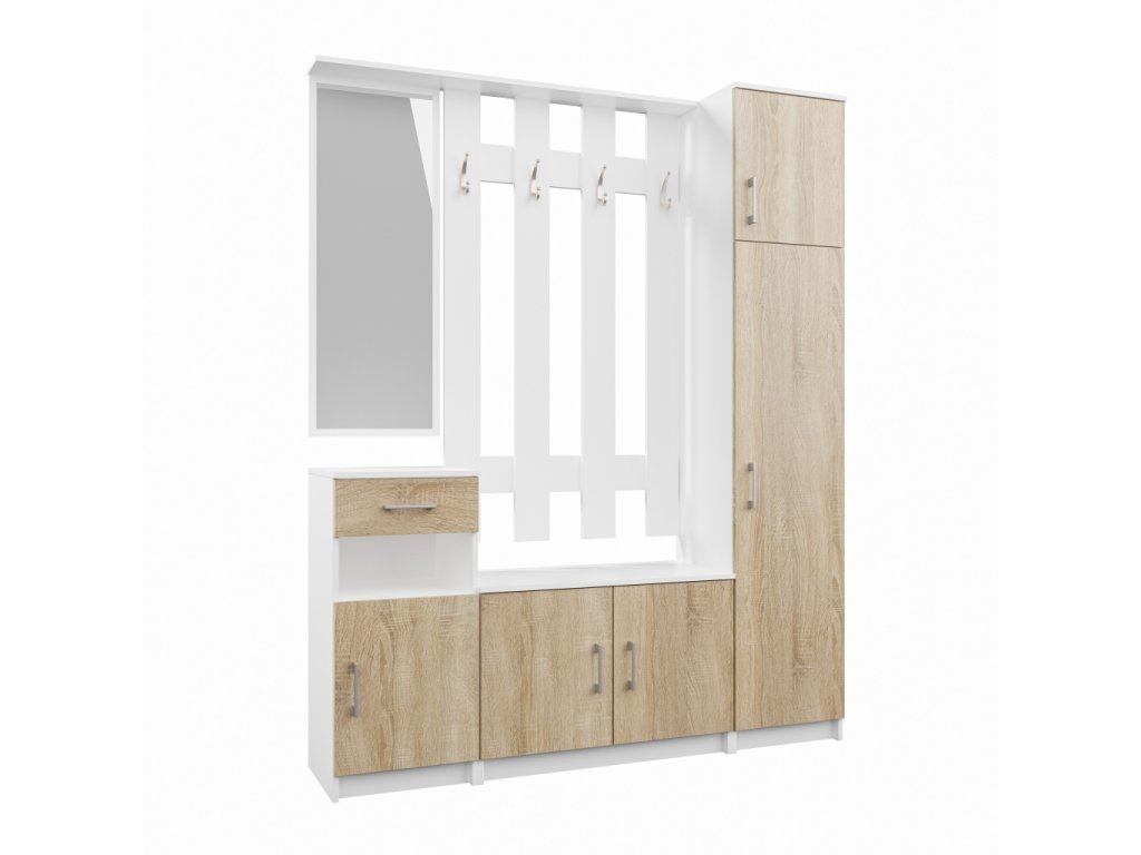 Predsieňová stena je vytvorená v príjemných farebných kombináciách. Je vyrobená z kvalitnej laminátovej dosky vo farbe dub sonoma, korpus je vo farbe biela. Vešiak aj zrkadlo je možné namontovať ľubovoľne každý zvlášť. Zostava obsahuje (šírka x výška x hĺbka): - zrkadlo 40 x 112 x 2 cm - vešiak 80 x 142 x 15 cm - komoda 40 x 87 x 38 cm - botník 80 x 55 x 38 cm - skriňa 40 x 202 160 x 202 x 38 cm Materiál: LTD lamino, úchyty: plast Farba: - korpus: biela - dvierka: dub sonoma Dodanie v demonteDodatočné parametre