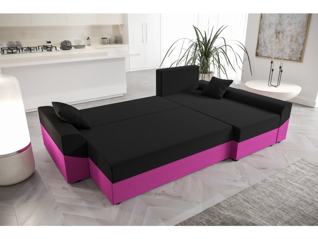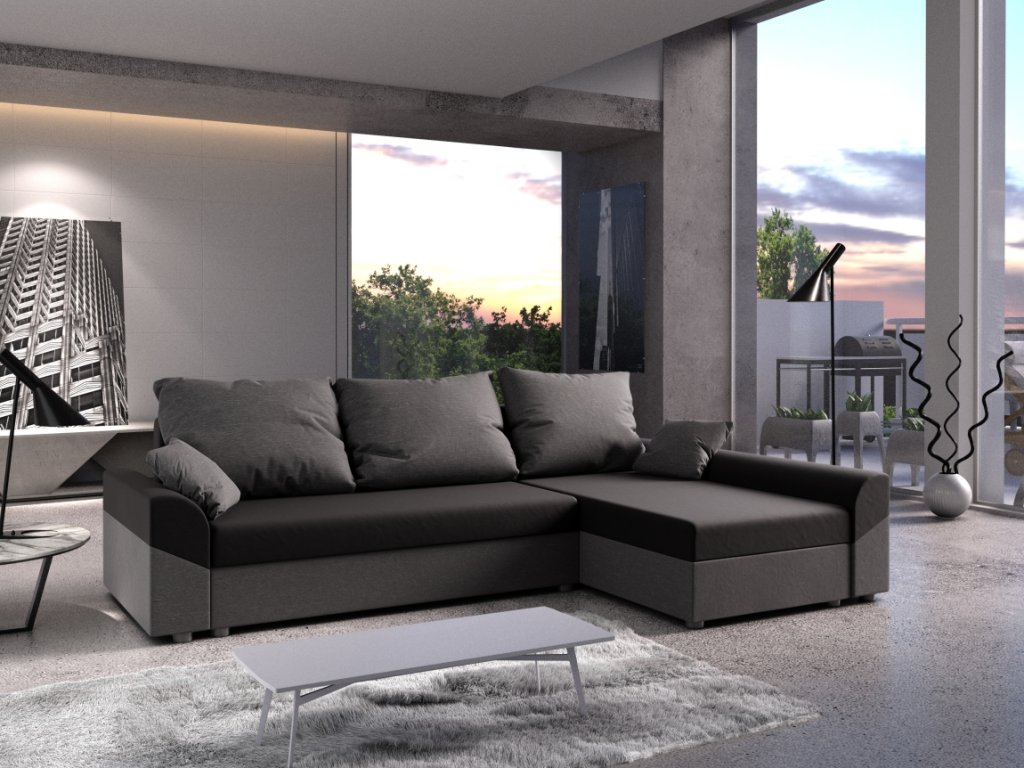 Rozkladacia rohová sedačka Sedačka je univerzálna = roh je možné zmontovať na pravý aj ľavý! Poťahová látka: sawana 14 = čierna látka/sawana 05 = tmavo šedá látka Súčasťou sú 3 zadné vankúše so zipsom, sada dekoračných vankúšov v rozmeroch 40x40 cm a 1 úložný priestor. Obrázok rozloženej sedačky je ilustratívny (iná farba)! Celkové rozmery (šxvxh): 239 x 66/80 (bez vankúšov/s vankúšmi) x 144 cm Ložná plocha (šxh): 200 x 132 cm Výška sedu: 37 cm Materiál: pružina vlnitá, polyuretánová pena T30 Dodávané v demonte.Dodatočné parametre