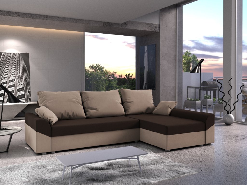 Rozkladacia rohová sedačka Sedačka je univerzálna = roh je možné zmontovať na pravý aj ľavý! Poťahová látka: mikrofáza 20 = hnedá látka/mikrofáza 05 = béžová látka Súčasťou sú 3 zadné vankúše so zipsom, sada dekoračných vankúšov v rozmeroch 40x40 cm a 1 úložný priestor. Obrázok rozloženej sedačky je ilustratívny (iná farba)! Celkové rozmery (šxvxh): 239 x 66/80 (bez vankúšov/s vankúšmi) x 144 cm Ložná plocha (šxh): 200 x 132 cm Výška sedu: 37 cm Materiál: pružina vlnitá, polyuretánová pena T30 Dodávané v demonte.Dodatočné parametre