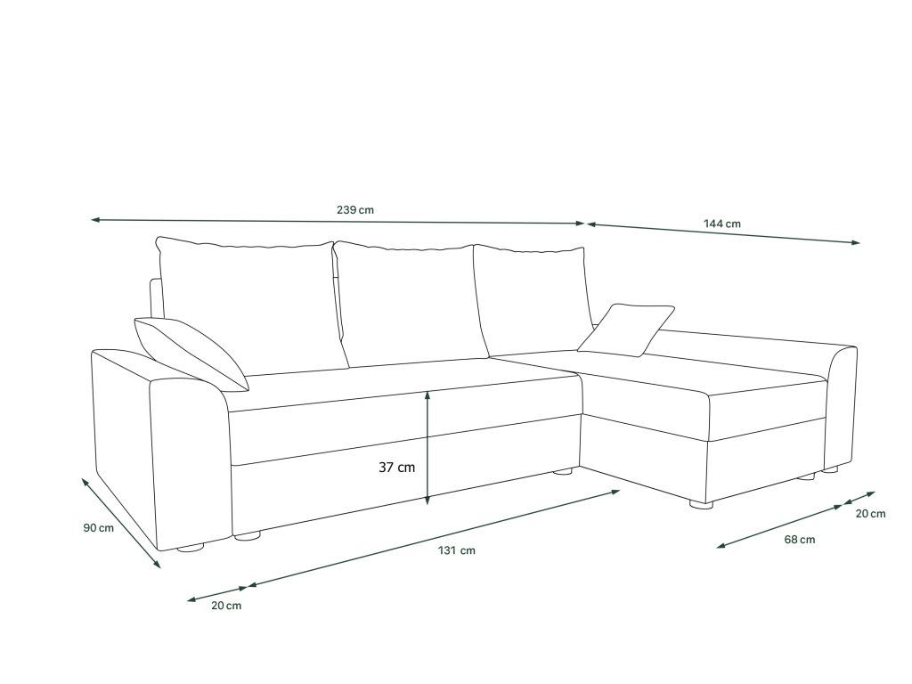 Rozkladacia rohová sedačka Sedačka je univerzálna = roh je možné zmontovať na pravý aj ľavý! Poťahová látka: sawana 05 = tmavo šedá látka Súčasťou sú 3 zadné vankúše so zipsom, sada dekoračných vankúšov v rozmeroch 40x40 cm a 1 úložný priestor. Obrázok rozloženej sedačky je ilustratívny (iná farba)! Celkové rozmery (šxvxh): 239 x 66/80 (bez vankúšov/s vankúšmi) x 144 cm Ložná plocha (šxh): 200 x 132 cm Výška sedu: 37 cm Materiál: pružina vlnitá, polyuretánová pena T30 Dodávané v demonte.Dodatočné parametre