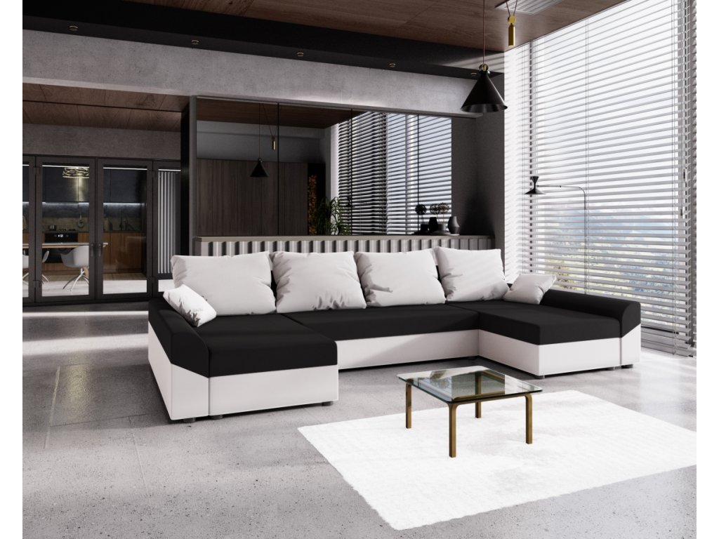 Rozkladacia rohová sedačka v tvare U Poťahová látka: mikrofáza 15 = čierna látka/mikrofáza 31 = biela látka Súčasťou sú 4 zadné vankúše so zipsom, sada dekoračných vankúšov v rozmeroch 40x40 cm a 1 úložný priestor. Obrázok rozloženej sedačky je ilustratívny (iná farba)! Celkové rozmery (šxvxh): 298 x 66/80 (bez vankúšov/s vankúšmi) x 144 cm Ložná plocha (šxh): 267 x 132 cm Výška sedu: 37 cm Materiál: pružina vlnitá, polyuretánová pena T30 Dodávané v demonte.Dodatočné parametre