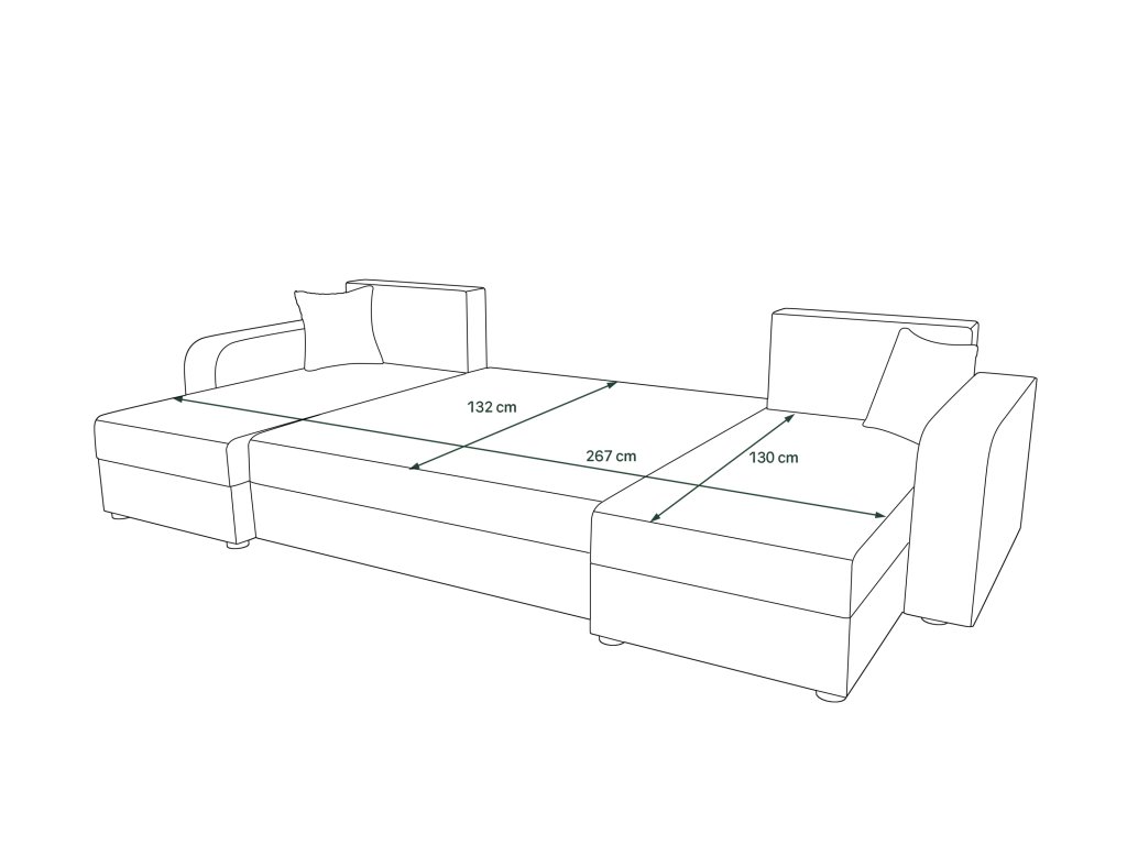 Rozkladacia rohová sedačka v tvare U Poťahová látka: sawana 05 = tmavo šedá látka Súčasťou sú 4 zadné vankúše so zipsom, dekoračné vankúše v rozmeroch 40 x 40 cm (na fotogragiách chýba) a 1 úložný priestor s rozmermi 128 x 56 cm. Obrázok rozloženej sedačky je ilustratívny (iná farba)! Celkové rozmery (šxhxv): 312 x 140 x 66/80 cm (bez vankúšov/s vankúšmi) Ložná plocha (šxh): 275 x 132 cm Výška sedu: 37 cm Hĺbka sedu: 70/125 cm (bez vankúšov) Materiál: pružina demontu. Rozmery balíkov: 2 x 142/74/68,38 1 x 52/68/134 1 x 58/87/34Dodatočné parametre