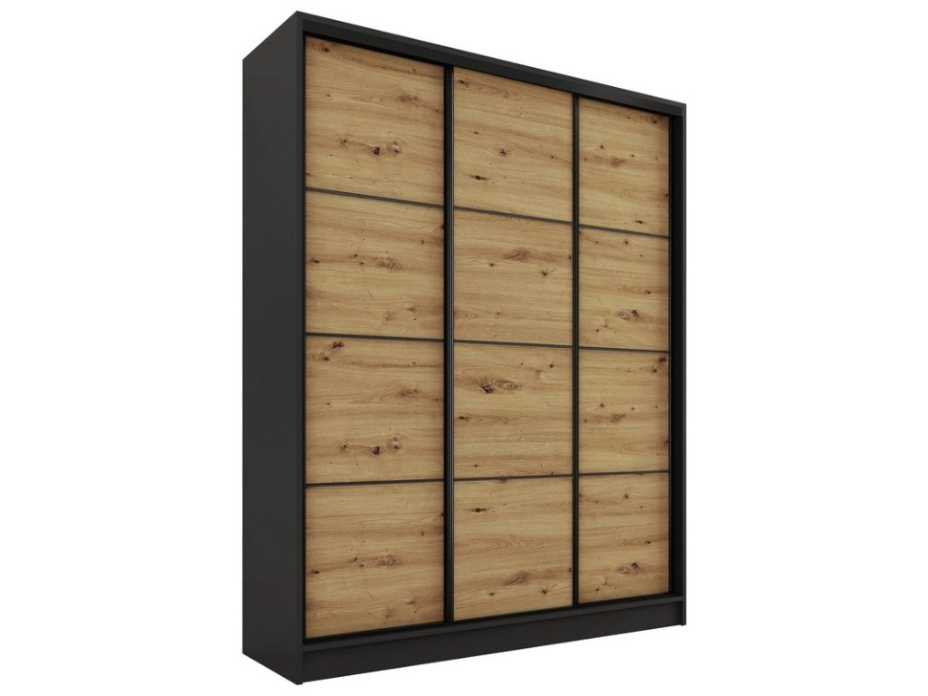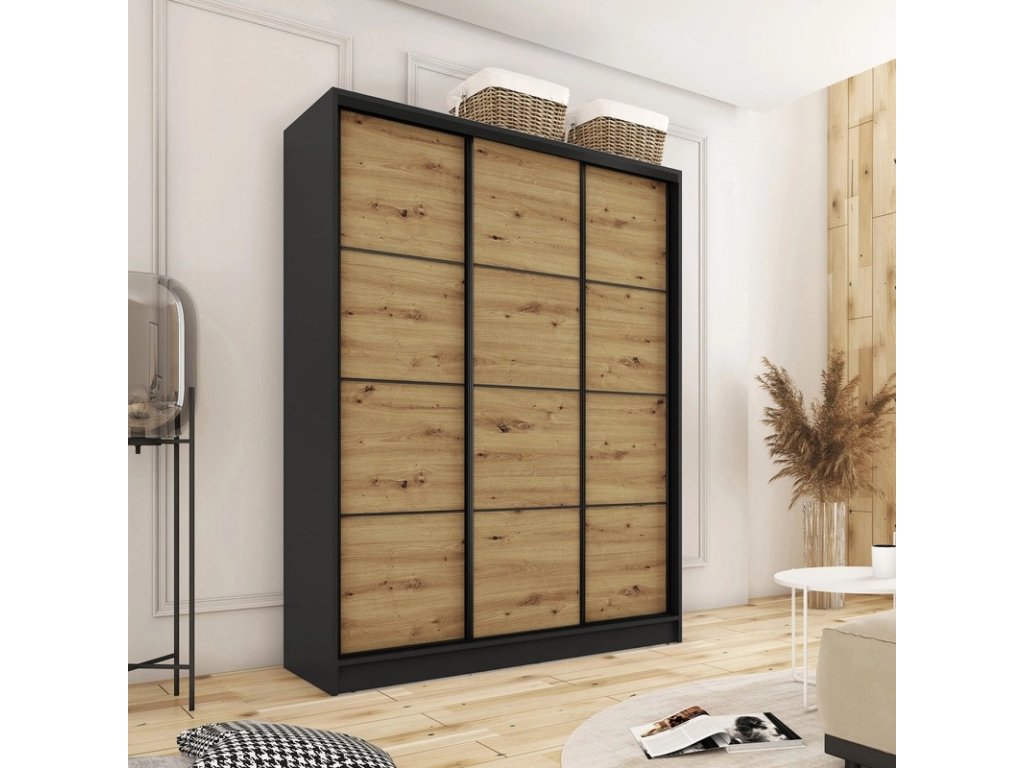 Kombinovaná šatníková skriňa s posuvnými dverami. Ozdobné lišty, ktoré sú na dverách skrine, nie je nutné na dvere inštalovať. Môžete tak mať hladké dvere bez líšt. Rozmery (šxvxh): 150 x 205 x 56 cm Materiál: lamino Farba: čierny mat/dub artisan Šatníková skriňa má: - 6 políc - 2 šatníkové tyče - 4 šuplíky Dodávané v demonteDodatočné parametre