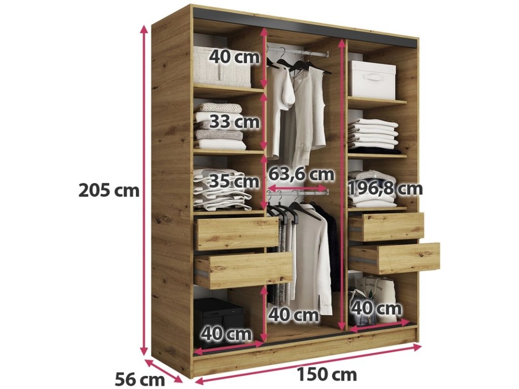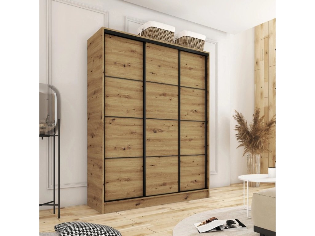 Kombinovaná šatníková skriňa s posuvnými dverami. Ozdobné lišty, ktoré sú na dverách skrine, nie je nutné na dvere inštalovať. Môžete tak mať hladké dvere bez líšt. Rozmery (šxvxh): 150 x 205 x 56 cm Materiál: lamino Farba: dub artisan Šatníková skriňa má: - 6 políc - 2 šatníkové tyče - 4 šuplíky. Dodávané v demonteDodatočné parametre