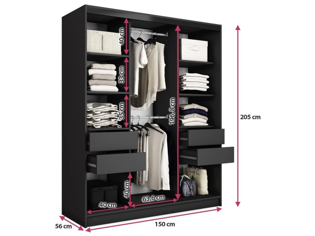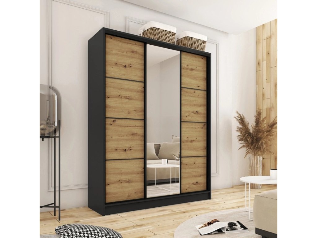Kombinovaná šatníková skriňa s posuvnými dverami a zrkadlom. Ozdobné lišty, ktoré sú na dverách skrine, nie je nutné na dvere inštalovať. Môžete tak mať hladké dvere bez líšt. Rozmery (šxvxh): 150 x 205 x 56 cm Materiál: lamino Farba: čierny mat/dub artisan Šatníková skriňa má: - 6 políc - 2 šatníkové tyče - 4 šuplíky Dodávané v demonteDodatočné parametre