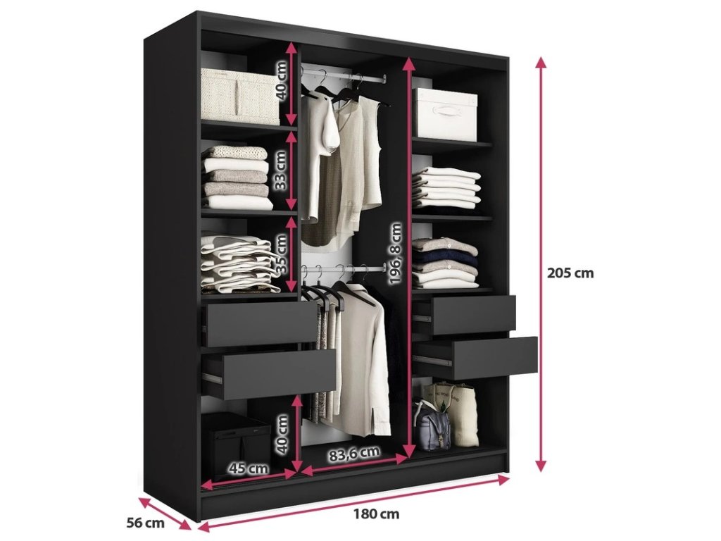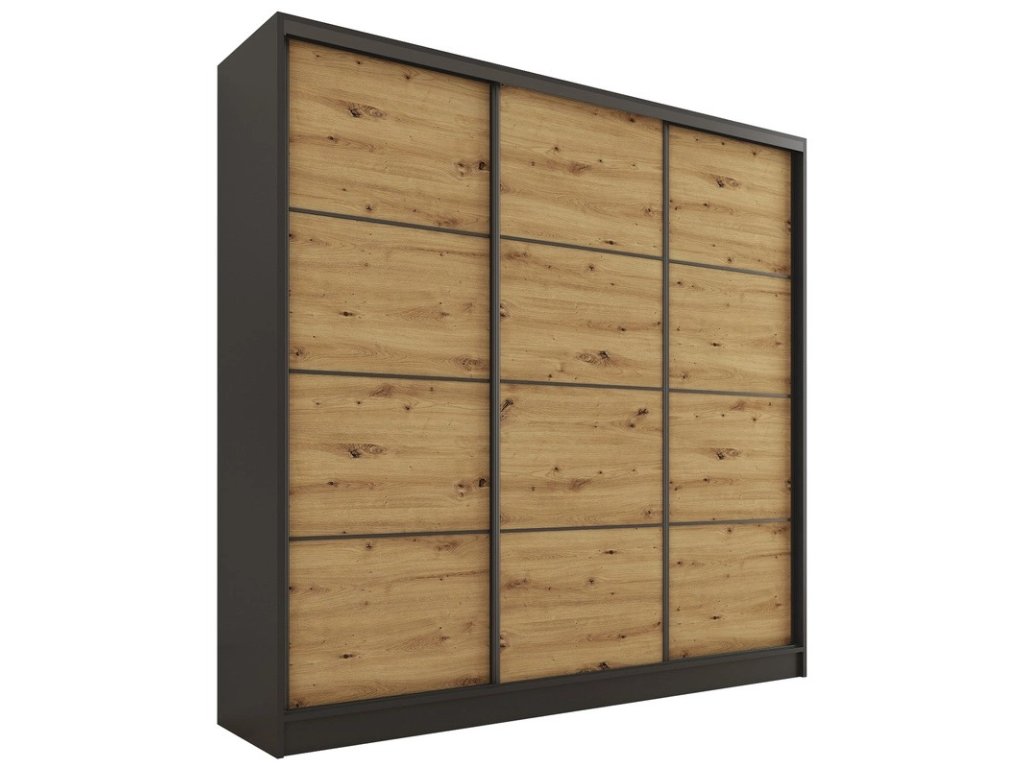 Kombinovaná šatníková skriňa s posuvnými dverami. Ozdobné lišty, ktoré sú na dverách skrine, nie je nutné na dvere inštalovať. Môžete tak mať hladké dvere bez líšt. Rozmery (šxvxh): 180 x 205 x 56 cm Materiál: lamino Farba: čierny mat/dub artisan Šatníková skriňa má: - 6 políc - 2 šatníkové tyče - 4 šuplíky Dodávané v demonteDodatočné parametre
