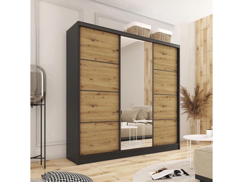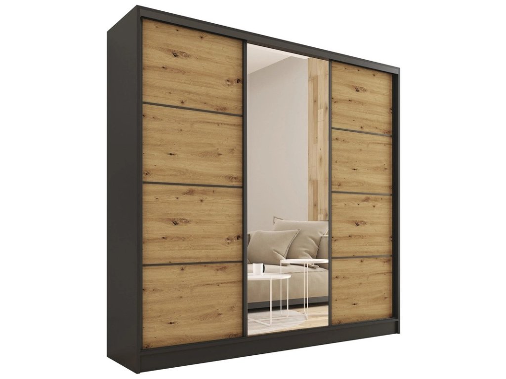 Kombinovaná šatníková skriňa s posuvnými dverami a zrkadlom. Ozdobné lišty, ktoré sú na dverách skrine, nie je nutné na dvere inštalovať. Môžete tak mať hladké dvere bez líšt. Rozmery (šxvxh): 180 x 205 x 56 cm Materiál: lamino Farba: čierny mat/dub artisan Šatníková skriňa má: - 6 políc - 2 šatníkové tyče - 4 šuplíky Dodávané v demonteDodatočné parametre
