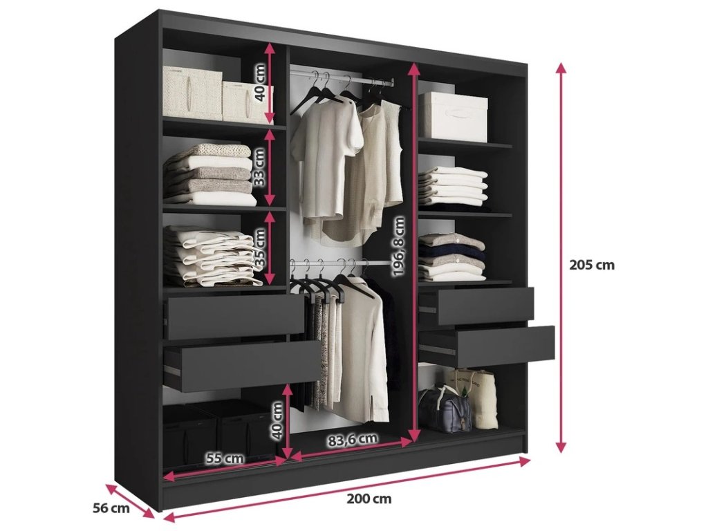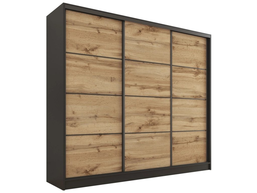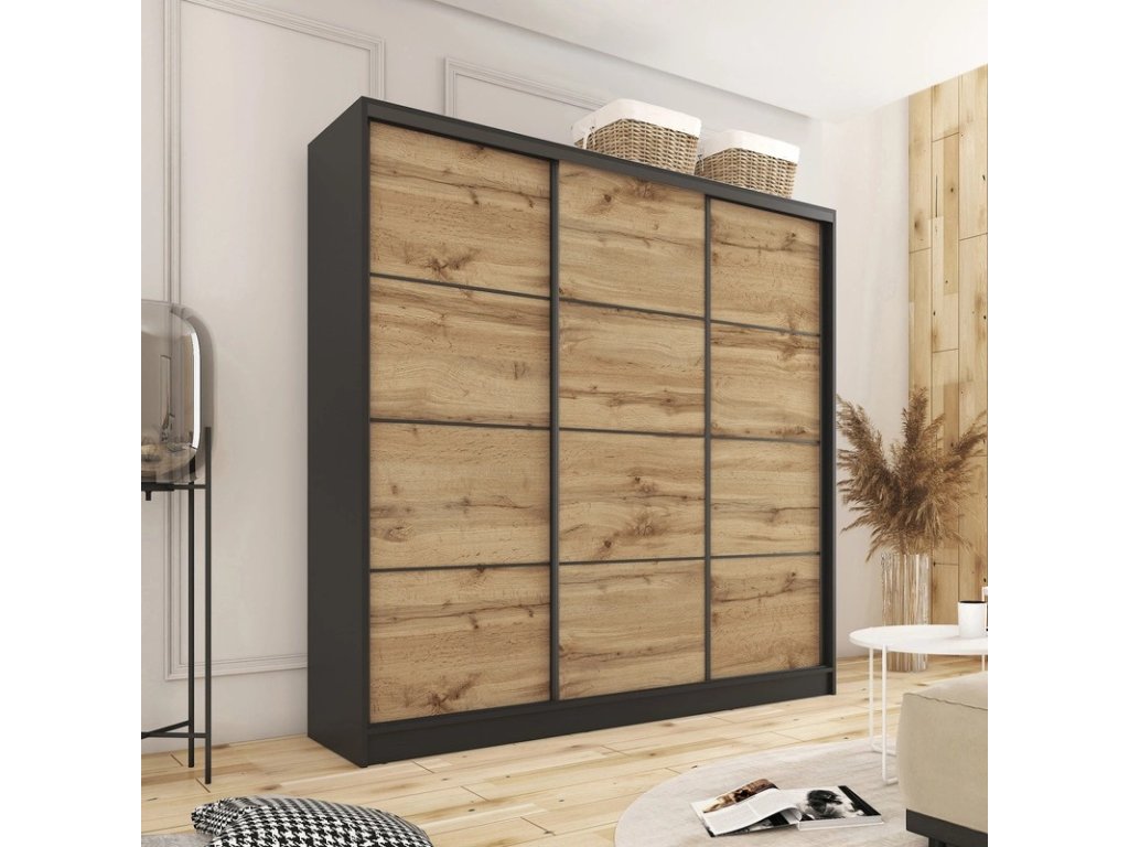 Kombinovaná šatníková skriňa s posuvnými dverami. Ozdobné lišty, ktoré sú na dverách skrine, nie je nutné na dvere inštalovať. Môžete tak mať hladké dvere bez líšt. Rozmery (šxvxh): 200 x 205 x 56 cm Materiál: lamino Farba: čierny mat/dub wotan Šatníková skriňa má: - 6 políc - 2 šatníkové tyče - 4 šuplíky Dodávané v demonteDodatočné parametre