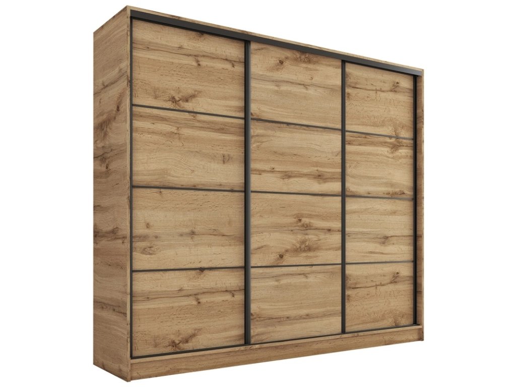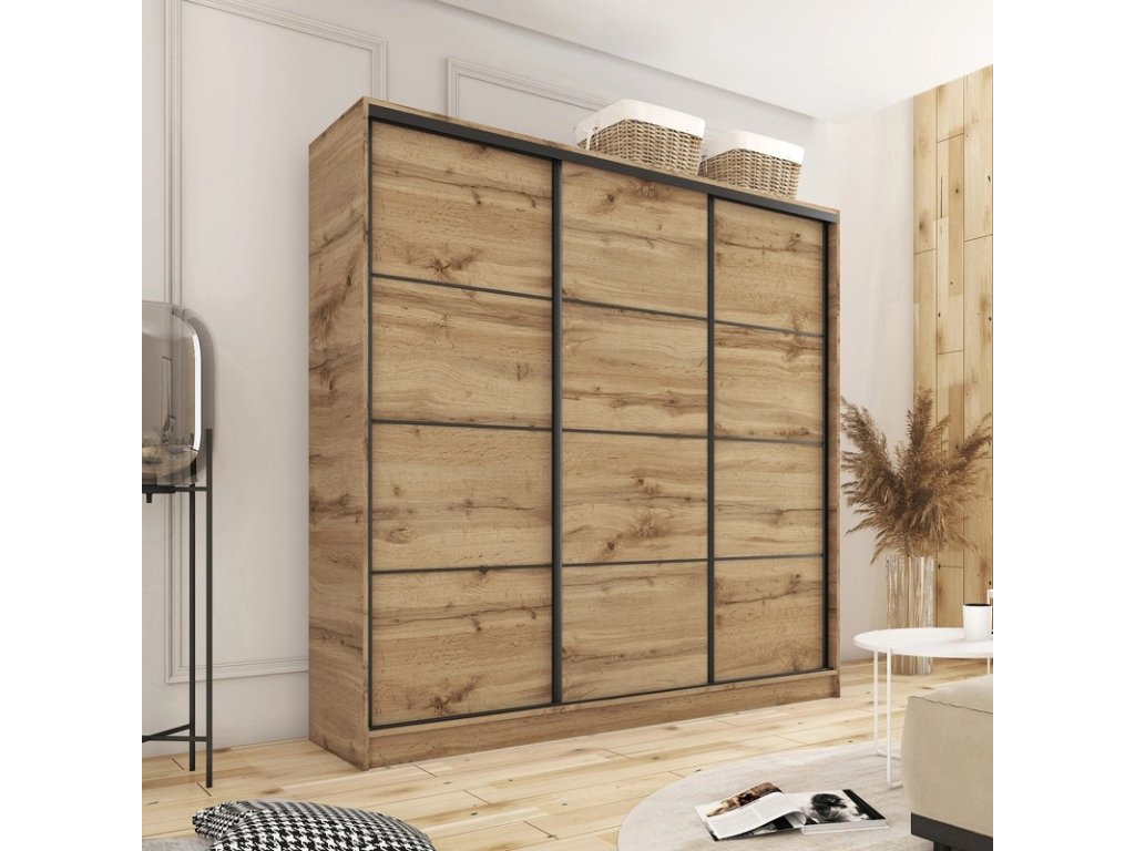 Kombinovaná šatníková skriňa s posuvnými dverami. Ozdobné lišty, ktoré sú na dverách skrine, nie je nutné na dvere inštalovať. Môžete tak mať hladké dvere bez líšt. Rozmery (šxvxh): 200 x 205 x 56 cm Materiál: lamino Farba: dub wotan Šatníková skriňa má: - 6 políc - 2 šatníkové tyče - 4 šuplíky Dodávané v demonteDodatočné parametre