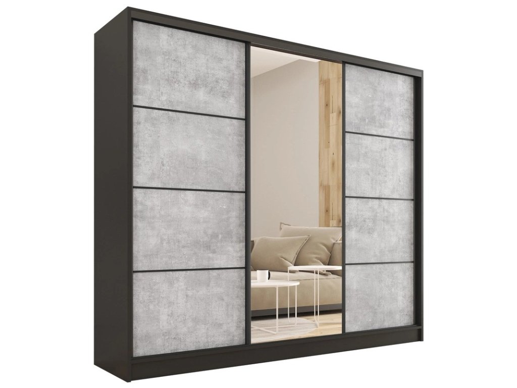 Kombinovaná šatníková skriňa s posuvnými dverami a zrkadlom. Ozdobné lišty, ktoré sú na dverách skrine, nie je nutné na dvere inštalovať. Môžete tak mať hladké dvere bez líšt. Rozmery (šxvxh): 200 x 205 x 56 cm Materiál: lamino Farba: čierny mat/betón Šatníková skriňa má: - 6 políc - 2 šatníkové tyče - 4 šuplíky Dodávané v demonteDodatočné parametre