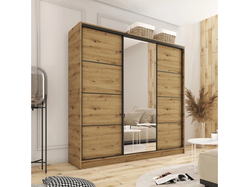 Kombinovaná šatníková skriňa s posuvnými dverami a zrkadlom. Ozdobné lišty, ktoré sú na dverách skrine, nie je nutné na dvere inštalovať. Môžete tak mať hladké dvere bez líšt. Rozmery (šxvxh): 200 x 205 x 56 cm Materiál: lamino Farba: dub artisan Šatníková skriňa má: - 6 políc - 2 šatníkové tyče - 4 šuplíky Dodávané v demonteDodatočné parametre