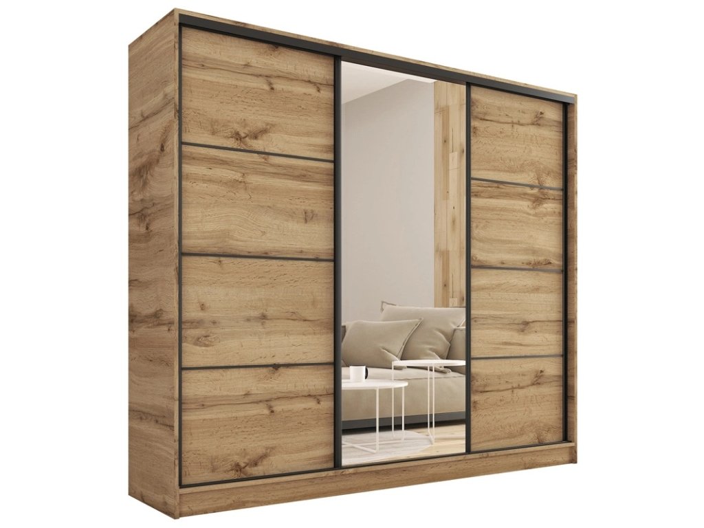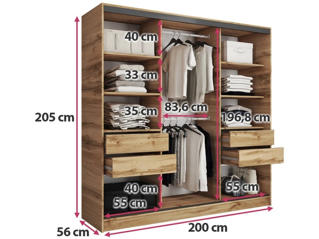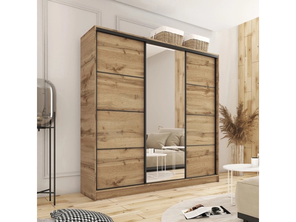 Kombinovaná šatníková skriňa s posuvnými dverami a zrkadlom. Ozdobné lišty, ktoré sú na dverách skrine, nie je nutné na dvere inštalovať. Môžete tak mať hladké dvere bez líšt. Rozmery (šxvxh): 200 x 205 x 56 cm Materiál: lamino Farba: dub wotan Šatníková skriňa má: - 6 políc - 2 šatníkové tyče - 4 šuplíky Dodávané v demonteDodatočné parametre