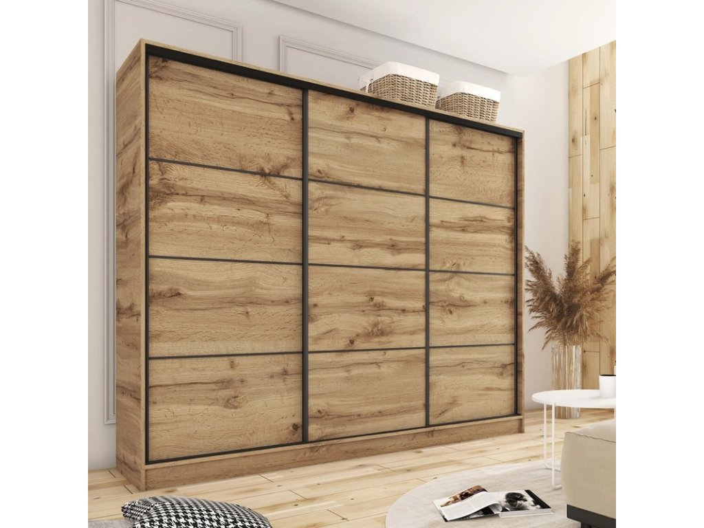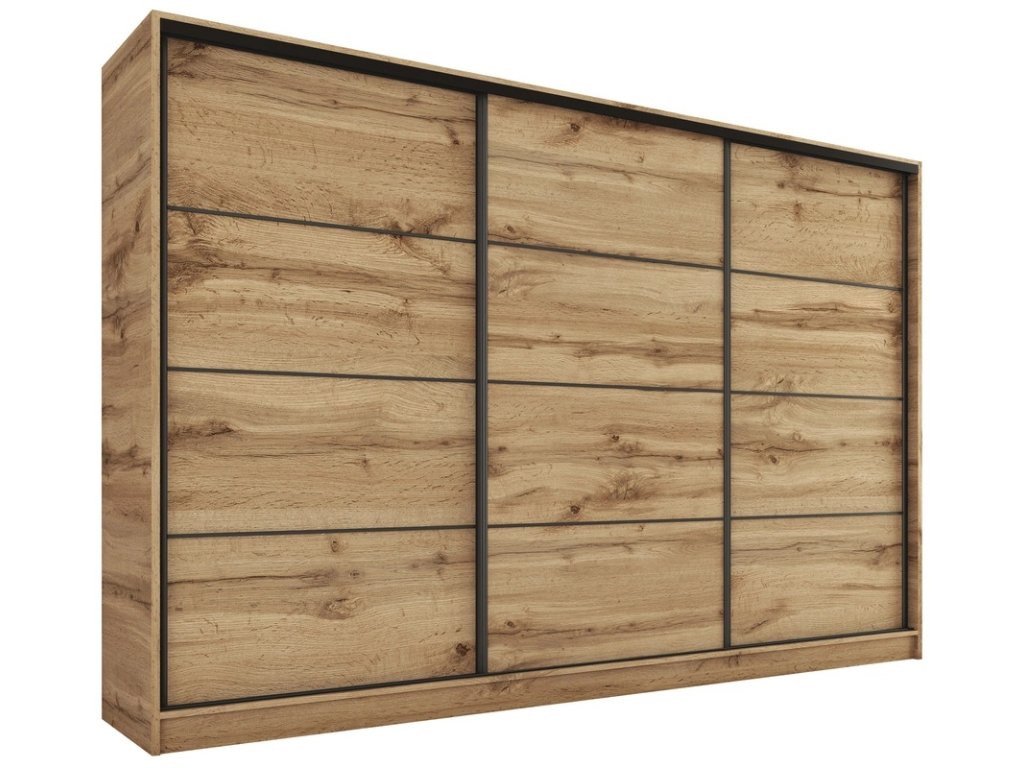 Kombinovaná šatníková skriňa s posuvnými dverami. Ozdobné lišty, ktoré sú na dverách skrine, nie je nutné na dvere inštalovať. Môžete tak mať hladké dvere bez líšt. Rozmery (šxvxh): 280 x 205 x 56 cm Materiál: lamino Farba: dub wotan Šatníková skriňa má: - 6 políc - 2 šatníkové tyče - 4 šuplíky Dodávané v demonteDodatočné parametre