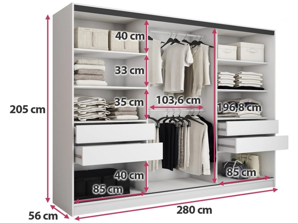 Kombinovaná šatníková skriňa s posuvnými dverami a zrkadlom. Ozdobné lišty, ktoré sú na dverách skrine, nie je nutné na dvere inštalovať. Môžete tak mať hladké dvere bez líšt. Rozmery (šxvxh): 280 x 205 x 56 cm Materiál: lamino Farba: biely mat Šatníková skriňa má: - 6 políc - 2 šatníkové tyče - 4 šuplíky Dodávané v demonte