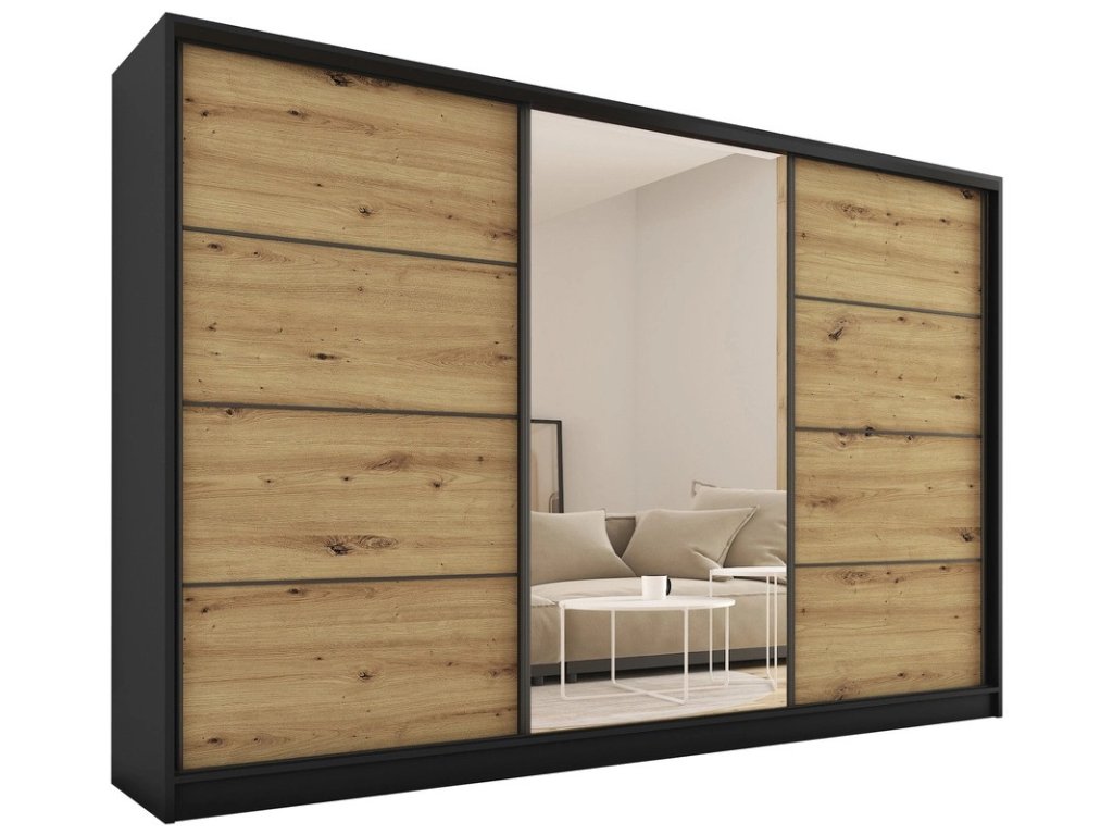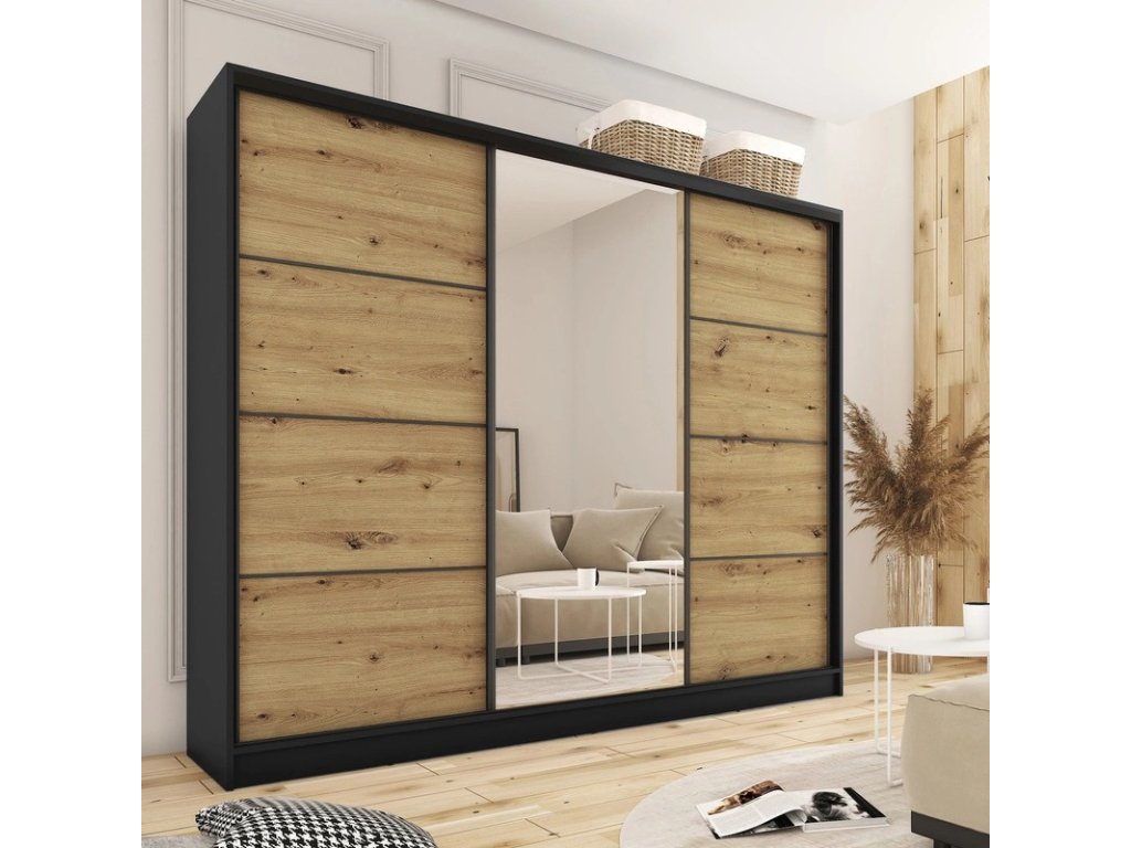 Kombinovaná šatníková skriňa s posuvnými dverami a zrkadlom. Ozdobné lišty, ktoré sú na dverách skrine, nie je nutné na dvere inštalovať. Môžete tak mať hladké dvere bez líšt. Rozmery (šxvxh): 280 x 205 x 56 cm Materiál: lamino Farba: čierny mat/dub artisan Šatníková skriňa má: - 6 políc - 2 šatníkové tyče - 4 šuplíky Dodávané v demonteDodatočné parametre