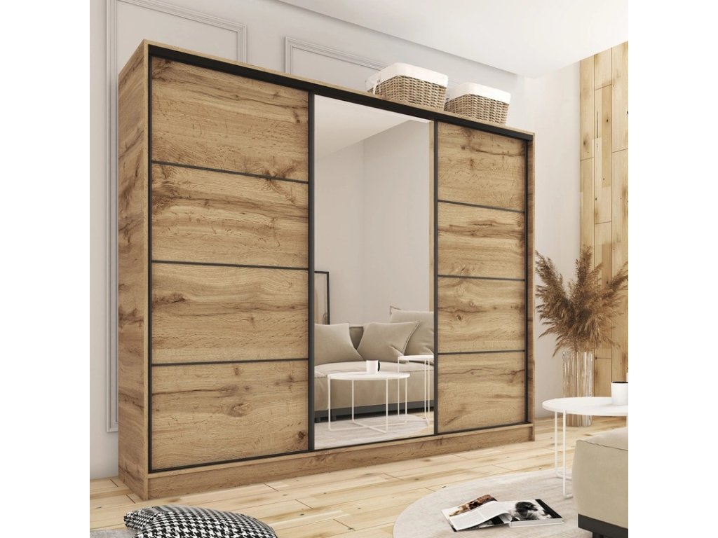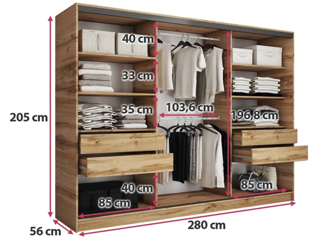 Kombinovaná šatníková skriňa s posuvnými dverami a zrkadlom. Ozdobné lišty, ktoré sú na dverách skrine, nie je nutné na dvere inštalovať. Môžete tak mať hladké dvere bez líšt. Rozmery (šxvxh): 280 x 205 x 56 cm Materiál: lamino Farba: dub wotan Šatníková skriňa má: - 6 políc - 2 šatníkové tyče - 4 šuplíky Dodávané v demonteDodatočné parametre