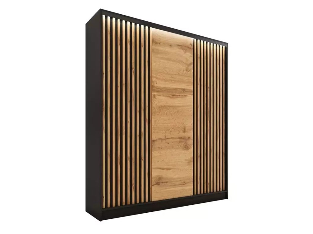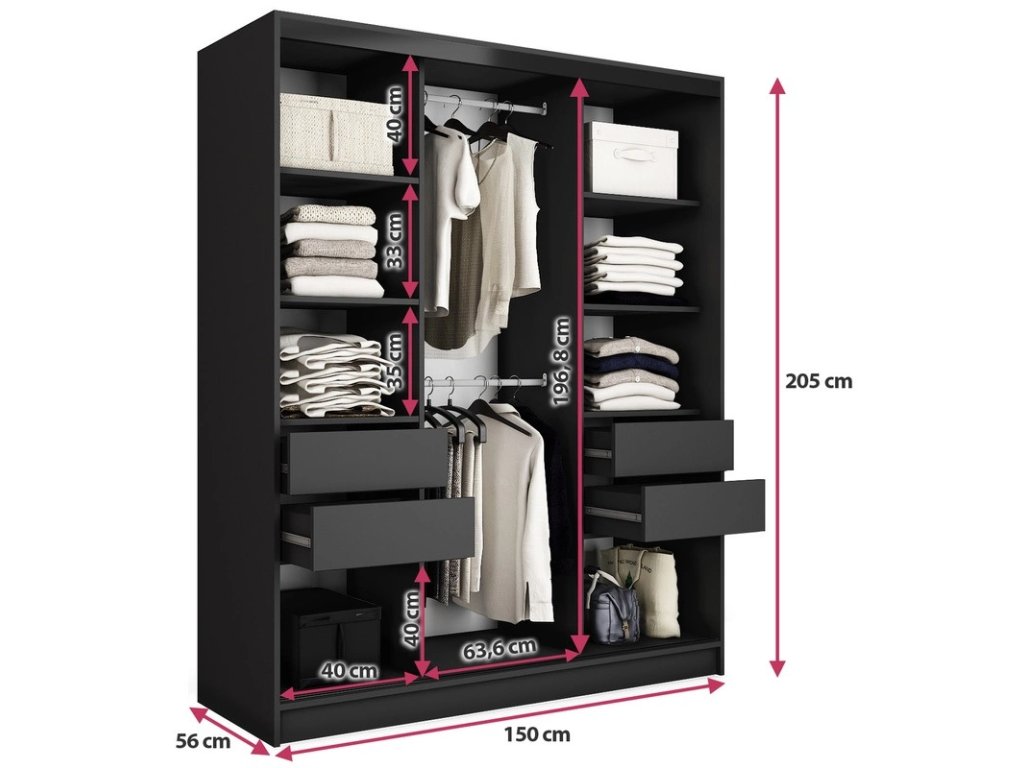 Šatníková skriňa s posuvnými dverami. Rozmery (šxvxh): 150 x 205 x 56 cm Materiál: lamino Farba: čierny mat/dub wotan Skriňa má: - 6 políc - 2 šatníkové tyče - 4 šuplíky Dodávané v demonteDodatočné parametre