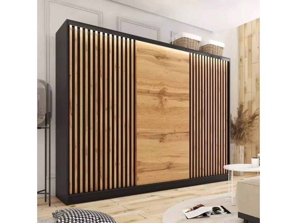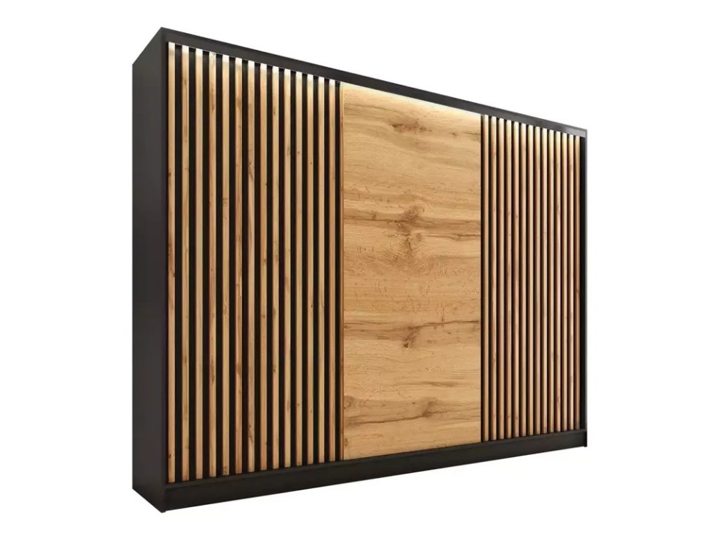 Šatníková skriňa s posuvnými dverami. Rozmery (šxvxh): 250 x 205 x 56 cm Materiál: lamino Farba: čierny mat/dub wotan Skriňa má: - 6 políc - 2 šatníkové tyče - 4 šuplíky Dodávané v demonteDodatočné parametre