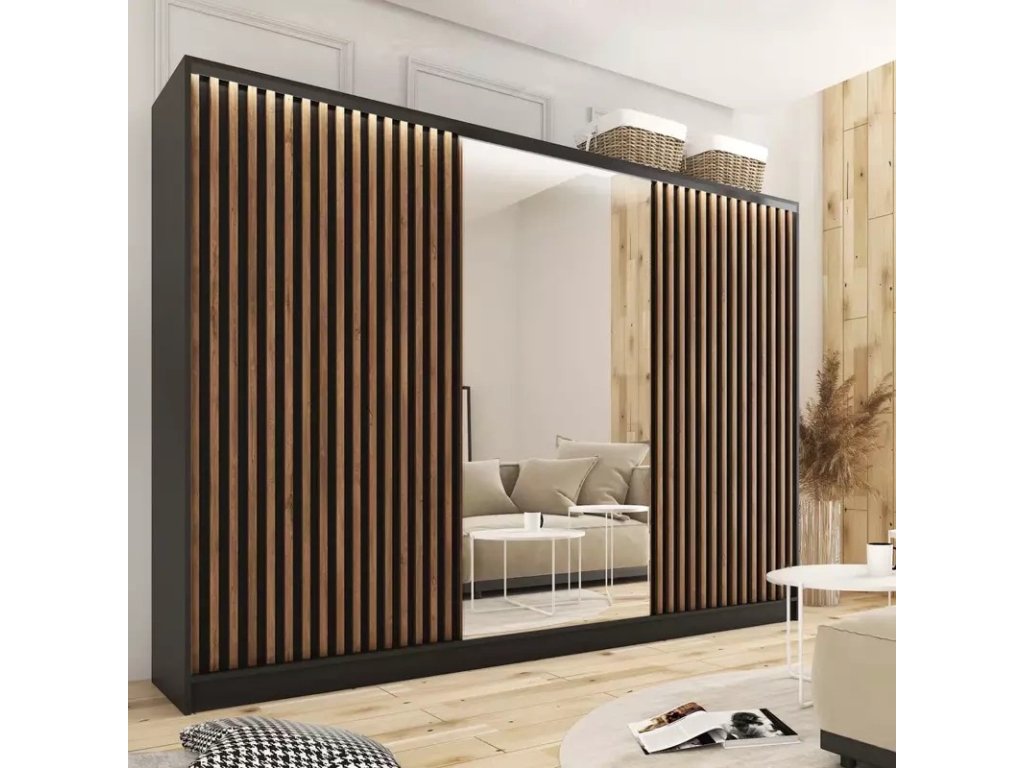Šatníková skriňa s posuvnými dverami a zrkadlom. Rozmery (šxvxh): 280 x 205 x 56 cm Materiál: lamino Farba: čierny mat/dub lefkas Skriňa má: - 6 políc - 2 šatníkové tyče - 4 šuplíky Dodávané v demonteDodatočné parametre