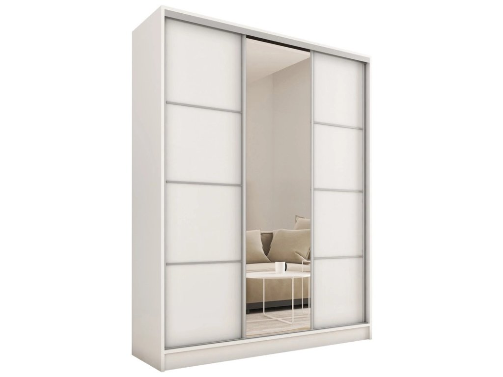Šatníková skriňa s posuvnými dverami a zrkadlom. Ozdobné lišty, ktoré sú na dverách skrine, nie je nutné na dvere inštalovať. Môžete tak mať hladké dvere bez líšt. Rozmery (šxvxh): 150 x 205 x 56 cm Materiál: lamino hrúbky 16 mm Farba: biely mat Skriňa má: - 6 políc - 2 šatníkové tyče - 4 šuplíky Dodávané v demonteDodatočné parametre