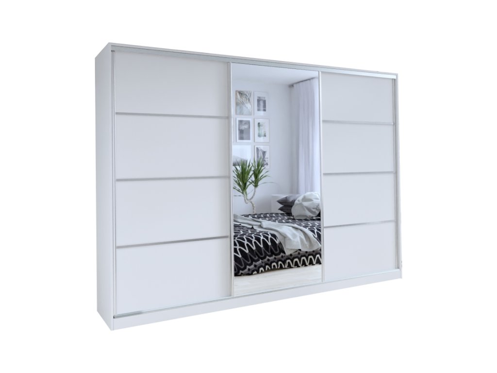 Šatníková skriňa s posuvnými dverami a zrkadlom. Ozdobné lišty, ktoré sú na dverách skrine, nie je nutné na dvere inštalovať. Môžete tak mať hladké dvere bez líšt. Rozmery (šxvxh): 280 x 205 x 56 cm Materiál: lamino Farba: biely mat Skriňa má: - 6 políc - 2 šatníkové tyče - 4 šuplíky Dodávané v demonteDodatočné parametre