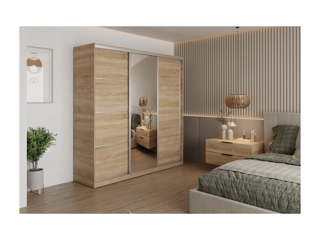 Trojdverová šatníková skriňa s posuvnými dverami a zrkadlom. Farba: dub sonoma so striebornými lištami Rozmery (šxvxh): 200 x 205 x 56,3 cm Materiál: - lamino - melamínová hrana - zásuvky na rolničkových výsuvoch Vnútri skrine nájdete zásuvky, police aj šatníkové tyče. Ozdobné lišty, ktoré sú na dverách skrine, nie je nutné na dvere inštalovať. Môžete tak mať hladké dvere bez líšt. Dodávané v demonte.Dodatočné parametre