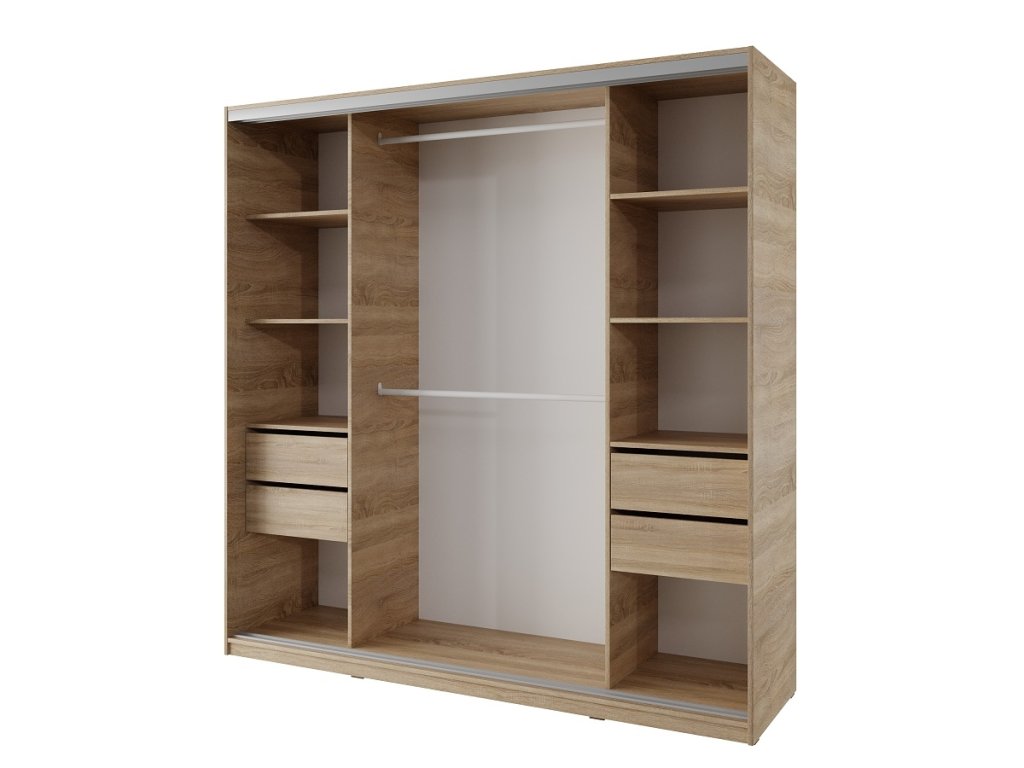 Šatníková skriňa NEJBY BARNABA 200 cm s posuvnými dverami, zrkadlom, 4 šuplíky a 2 šatníkovými tyčami, dub sonoma