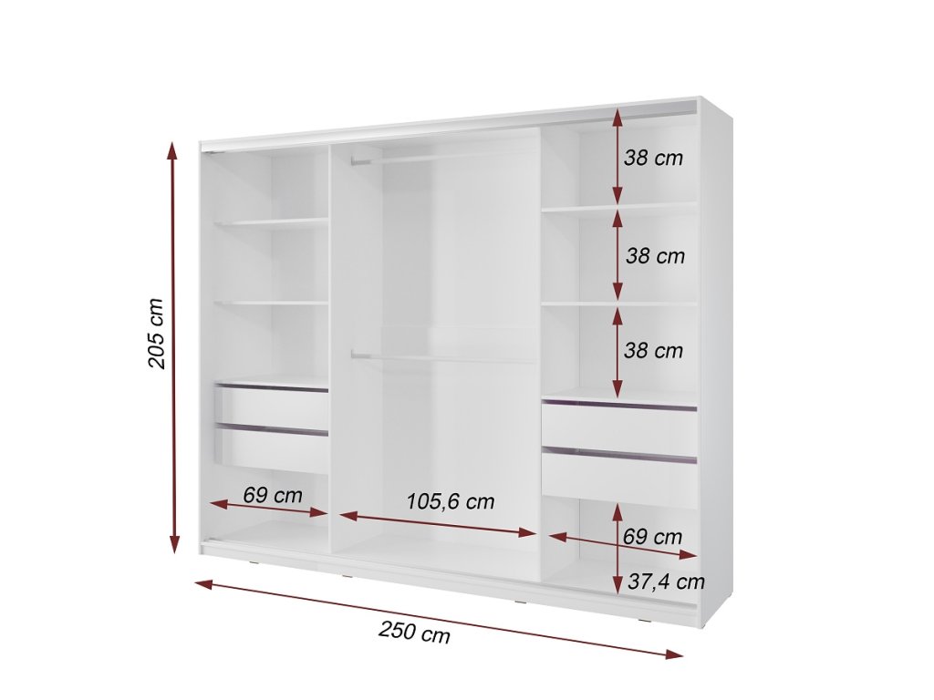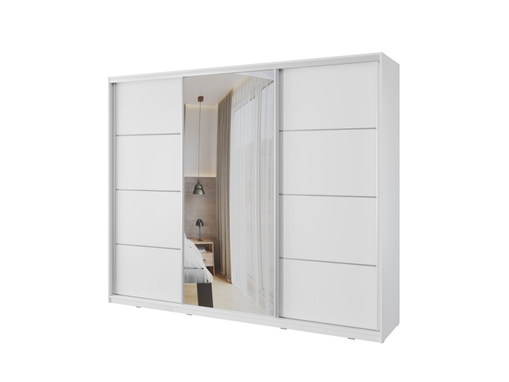 Trojdverová šatníková skriňa s posuvnými dverami a zrkadlom. Farba: biela Rozmery (šxvxh): 250 x 205 x 56,3 cm Materiál: - lamino - melamínová hrana - zásuvky na rolničkových výsuvoch Vnútri skrine nájdete zásuvky, police aj šatníkové tyče. Ozdobné lišty, ktoré sú na dverách skrine, nie je nutné na dvere inštalovať. Môžete tak mať hladké dvere bez líšt. Dodávané v demonte.Dodatočné parametre