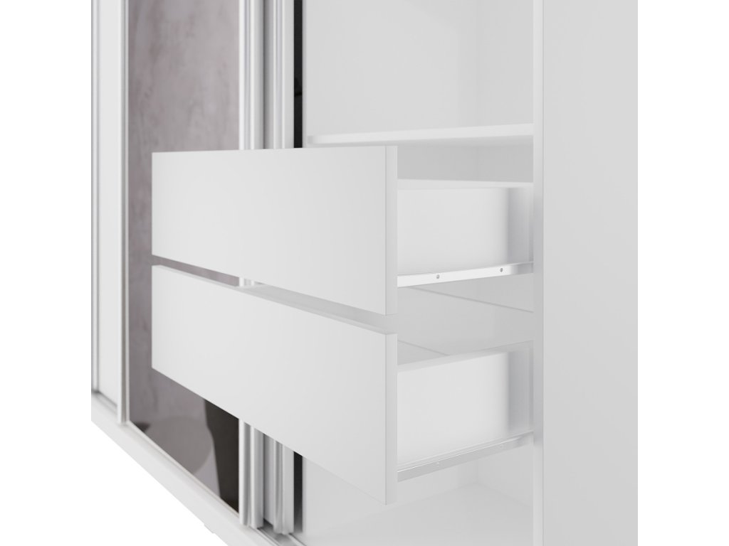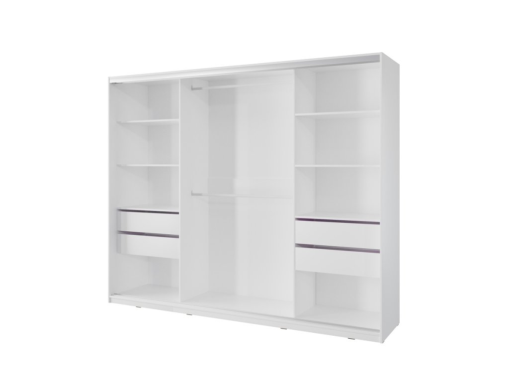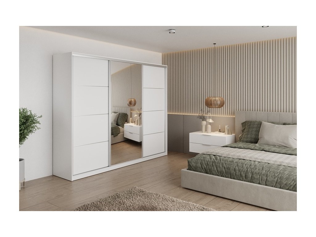 Šatníková skriňa NEJBY BARNABA 250 cm s posuvnými dverami, zrkadlom, 4 šuplíky a 2 šatníkovými tyčami, biela