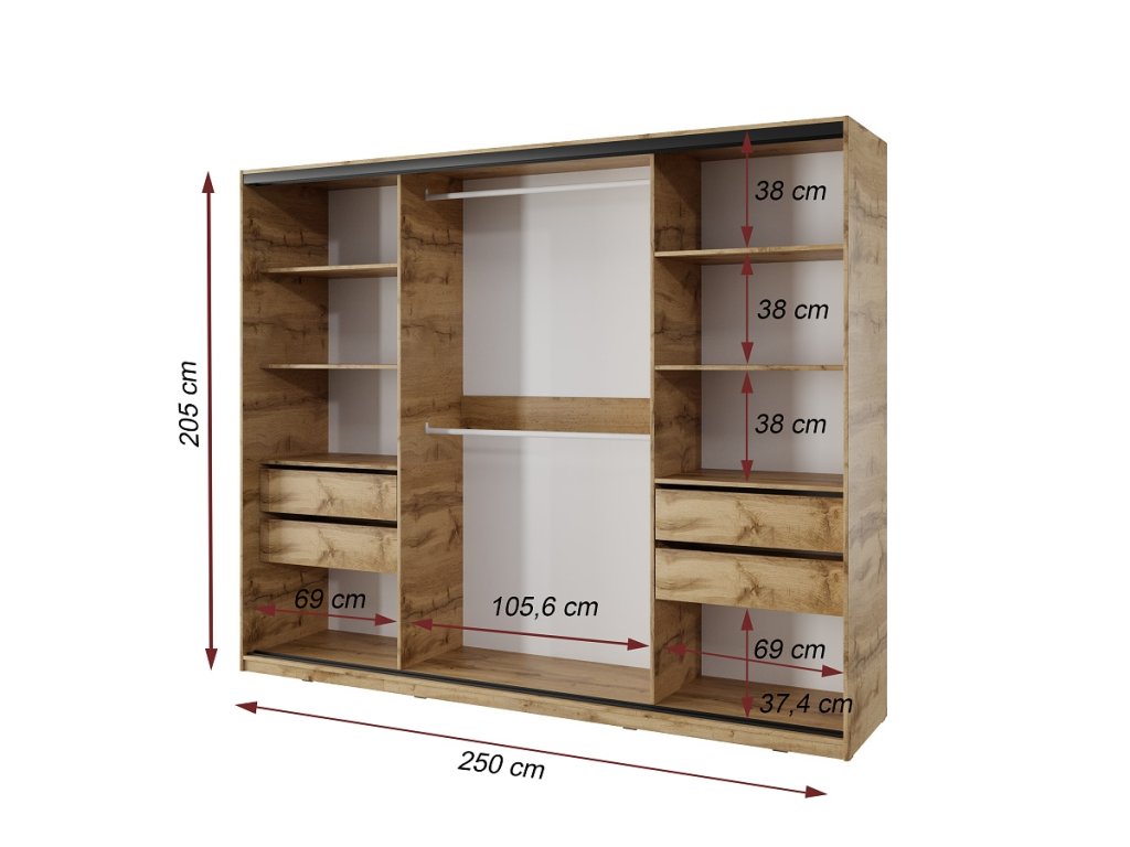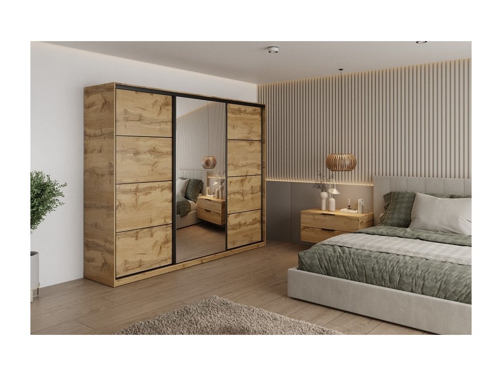 Šatníková skriňa NEJBY BARNABA 250 cm s posuvnými dverami, zrkadlom, 4 šuplíky a 2 šatníkovými tyčami, dub wotan
