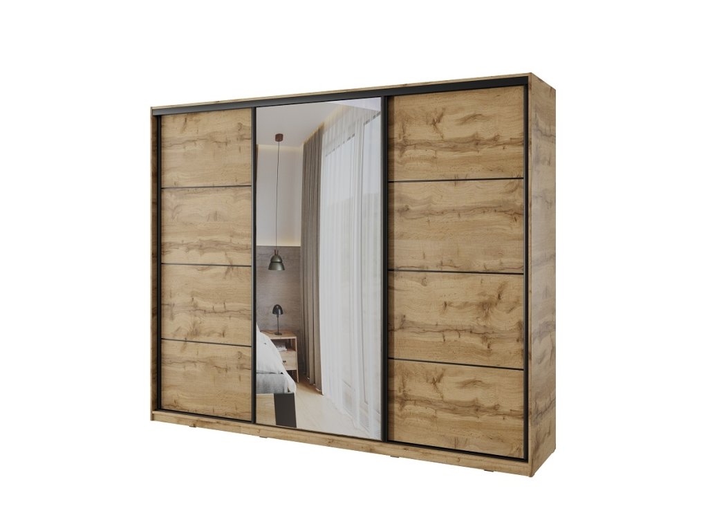 Trojdverová šatníková skriňa s posuvnými dverami a zrkadlom. Farba: dub wotan s čiernymi lištami Rozmery (šxvxh): 250 x 205 x 56,3 cm Materiál: - lamino - melamínová hrana - zásuvky na rolničkových výsuvoch Vnútri skrine nájdete zásuvky, police aj šatníkové tyče. Ozdobné lišty, ktoré sú na dverách skrine, nie je nutné na dvere inštalovať. Môžete tak mať hladké dvere bez líšt. Dodávané v demonte.Dodatočné parametre