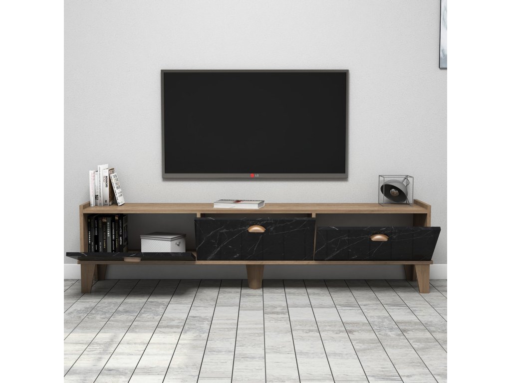 Technické detaily: Materiál: Materiál: 100% melamínom potiahnutá drevotrieska Hrúbka: 18 mm Šírka: 178 cm Výška: 44. 8 cm Hĺbka: 34,6 cm Farba: dub a mramor Dodávané v demonte.Dodatočné parametre